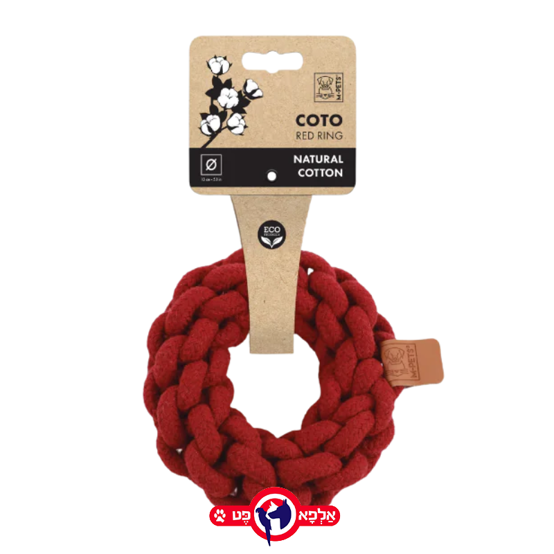 ה-COTO Red Ring מבית M-PETS היא טבעת חבל עמידה ואיכותית, המיועדת לספק לכלב שעות של משחק אינטראקטיבי ולעיסה מהנה. הטבעת עשויה מכותנה טבעית שזורה בעיצוב דחוס, המהווה פתרון מצוין למשחקי משיכה ("Tug of war"), זריקה והבאה, תוך שהיא מסייעת בשמירה על היגיינת הפה של הכלב.
