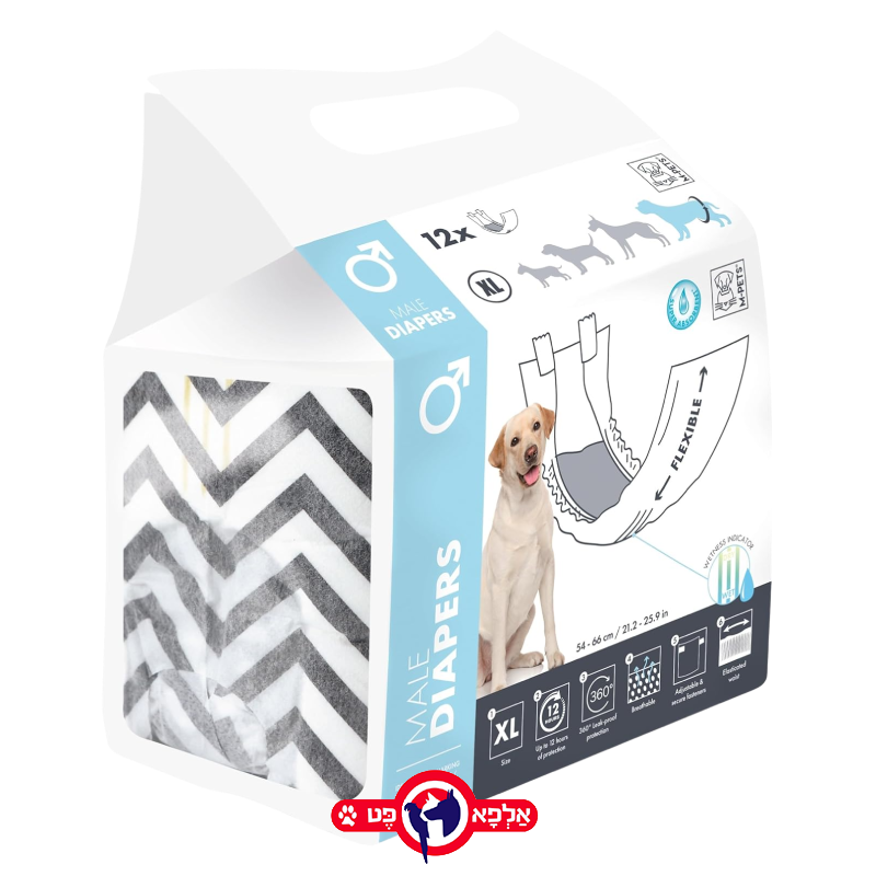 חיתולי M-PETS לזכרים במידה XL עוצבו במיוחד עבור כלבים מגזעים גדולים מאוד, כדי לספק פתרון היגייני ונוח המותאם למבנה האנטומי של הכלב הזכר. הם אידיאליים למניעת סימון טריטוריה (Spot Marking) בתוך הבית, לכלבים הסובלים מבריחת שתן (Incontinence), לכלבים מבוגרים או כפתרון נוח בזמן נסיעות וטיולים. החיתולים גמישים ומאפשרים לכלב חופש תנועה מלא תוך שמירה על סביבה נקייה ויבשה.
